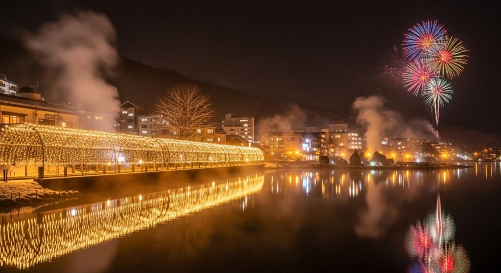 🌌 洞爺湖 — 光と花火が舞う温泉街